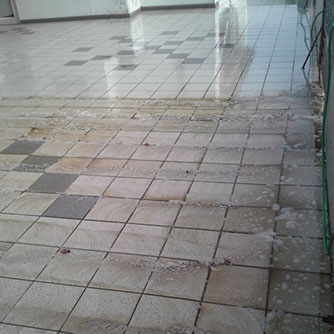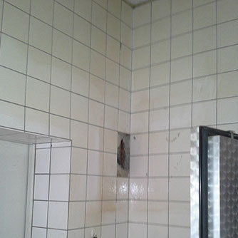 Kühlraum mit stark verschmutzter Wandbefliesung und erste Reinigungserfolge